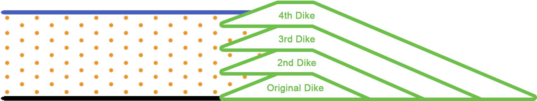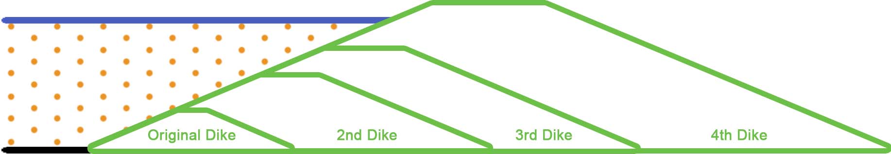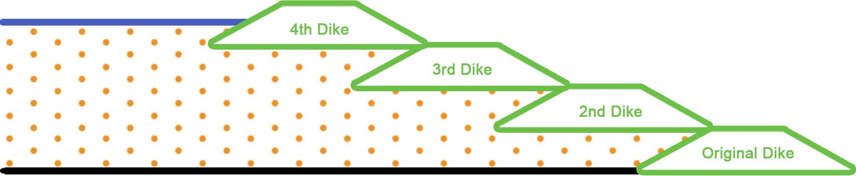 Downstream: This method raises the impoundment height downstream from the initial dike which is built from borrowed fill materials.